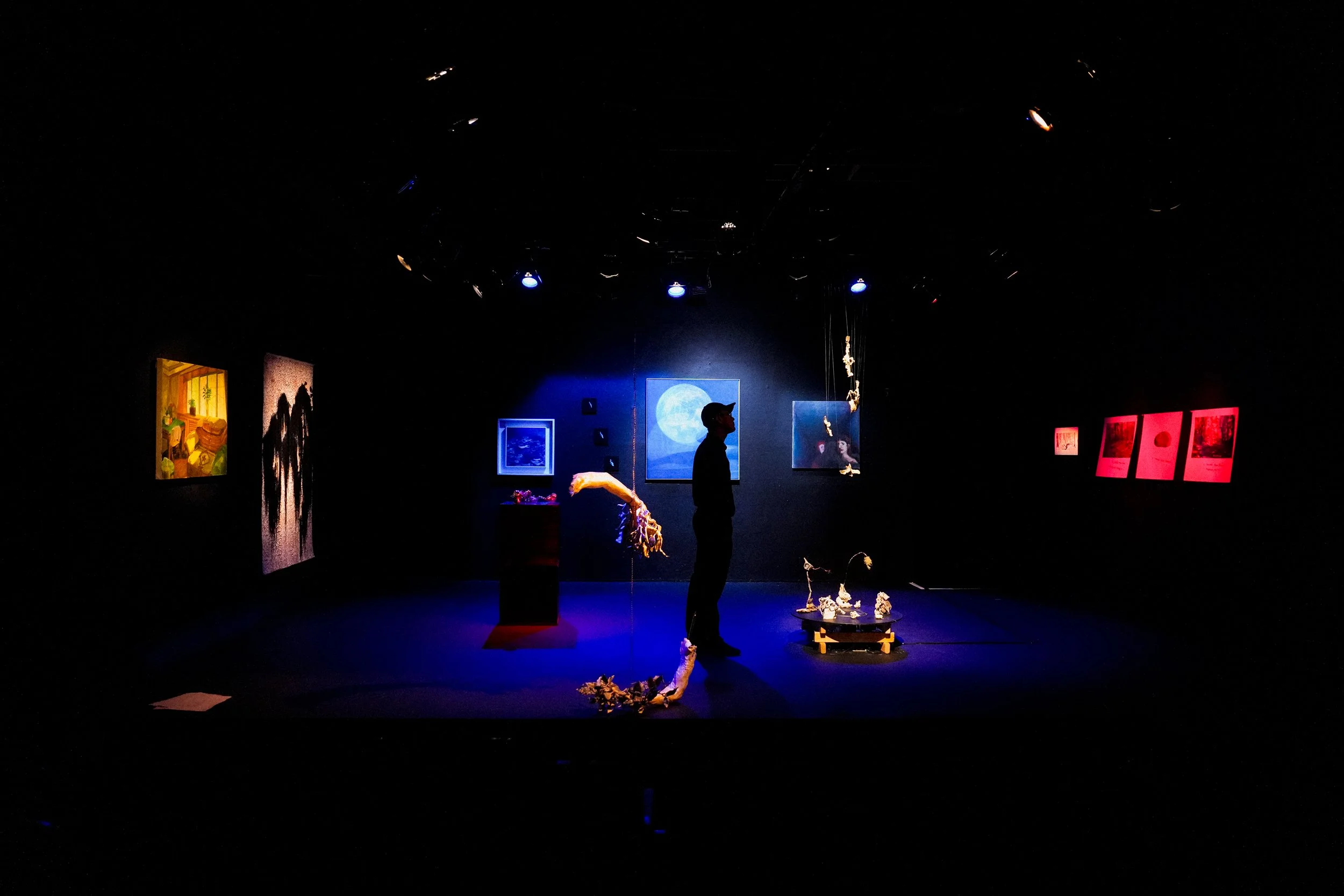 To the End of the Night suggests a departure from the 'light' of enlightenment and Western-centric dualistic thinking. We want to foreground the affects of materiality, the hidden tales and relations, and to activate the audience's bodily experiences. In contrast to bright and 'day-time' exhibition experiences, this project is a night-time stroll, a black-box dreamscape, as well as an intimate ghost town, paved by traces of past lives and materials in decay.