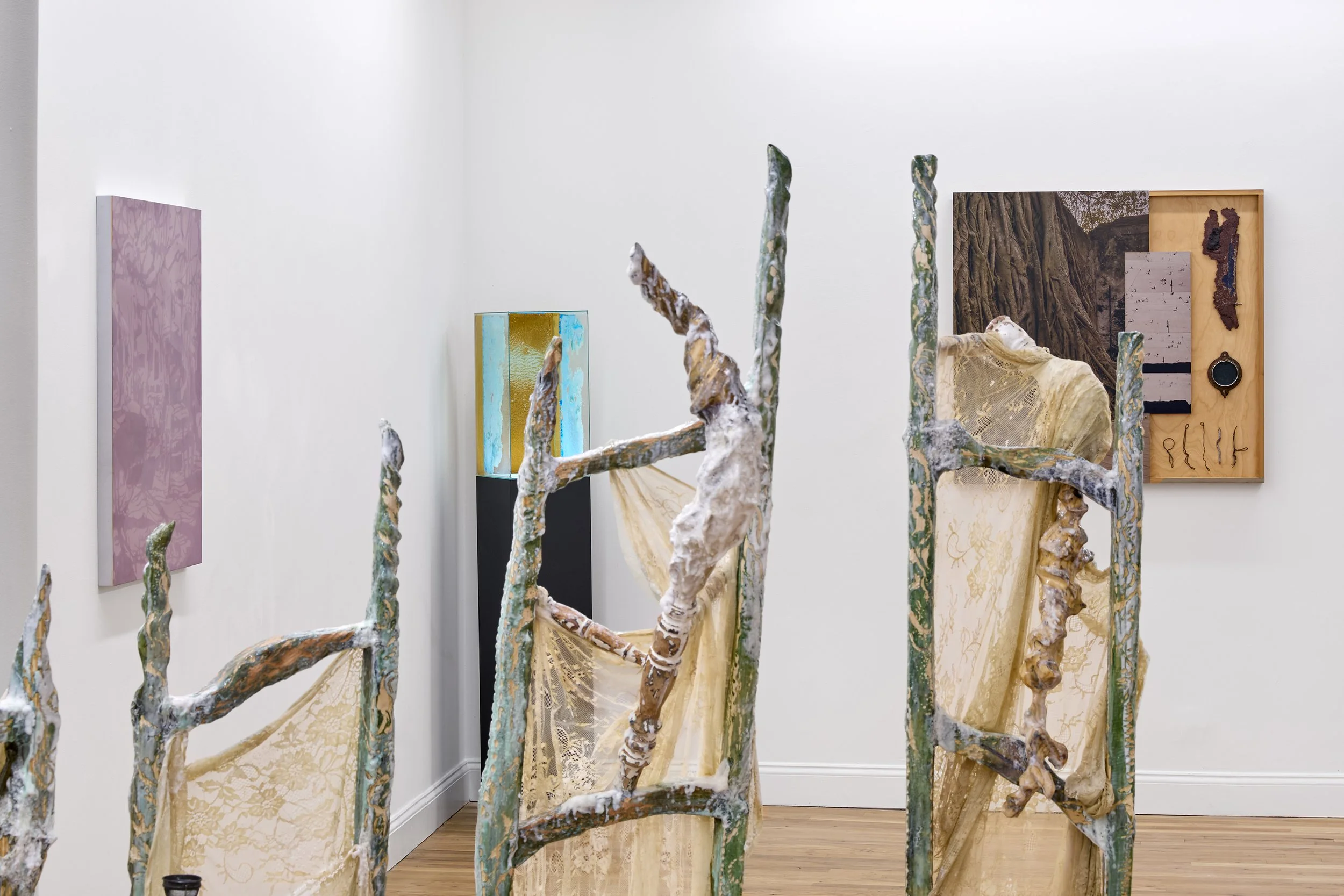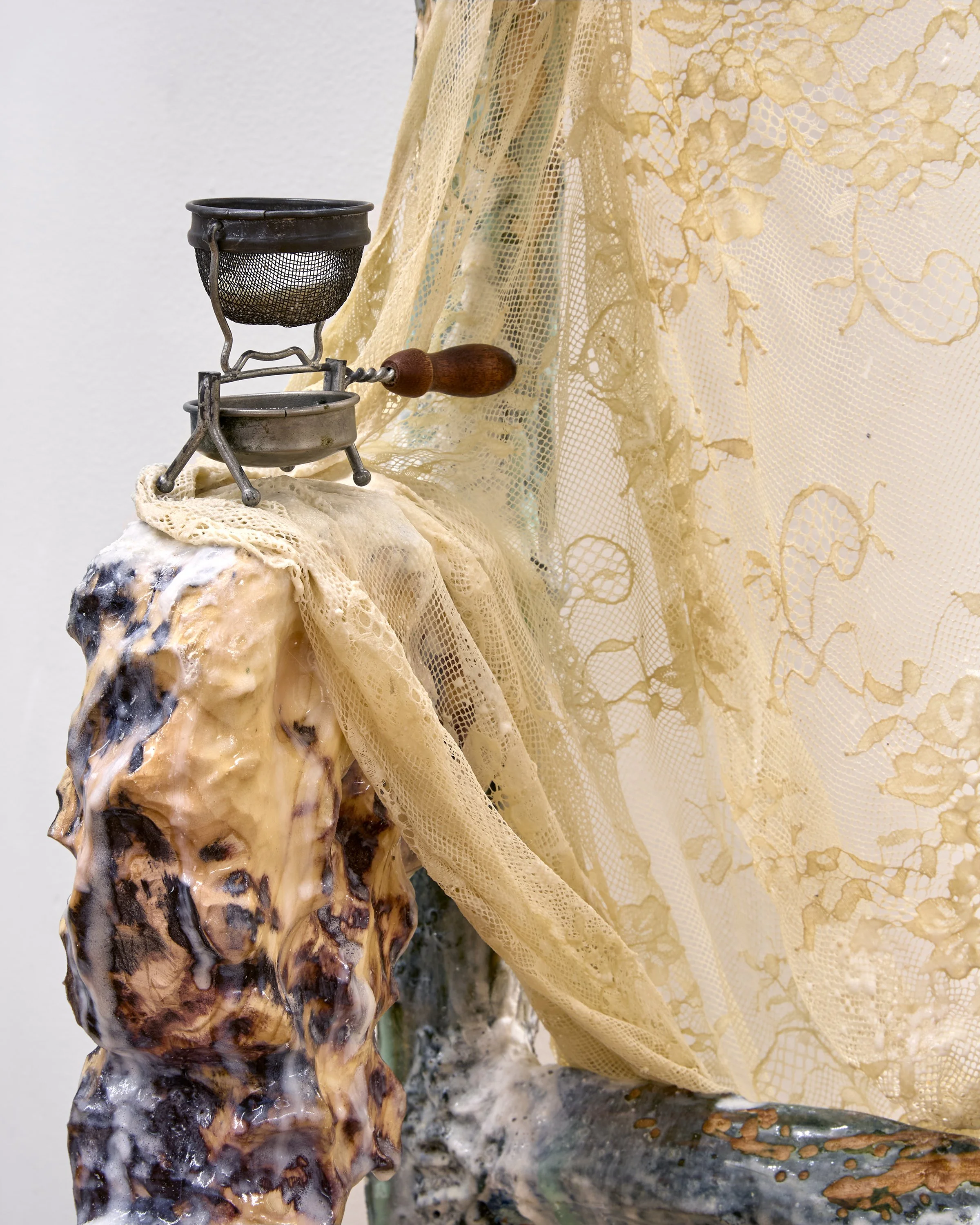 If Barrio and Osborne’s works trace monstrosity on a molecular and abstract register, where bodies glitch and mutate, Echo Yan and Kosuke Kawahara bring us back to the domestic interior. Created for this exhibition, Echo Yan’s sculptural Screen shifts the lens to the ordinary home. Composed of pine, resin, lace tablecloths, and bits of household debris, this four-panel divider presents not a boundary but a zone of slow absorption. Across each panel, bodies blur into objects: limbs contort into chair legs, furniture sprouts skin, tools begin to breathe. The household swallows the figure until it’s no longer clear where one ends and the other begins. Her materials soften, bend, and cling, calmly staging the horror of the mundane. Here, metamorphosis is not explosive but held, erotically contained, folding struggle, ambiguity, and power into its own shape.